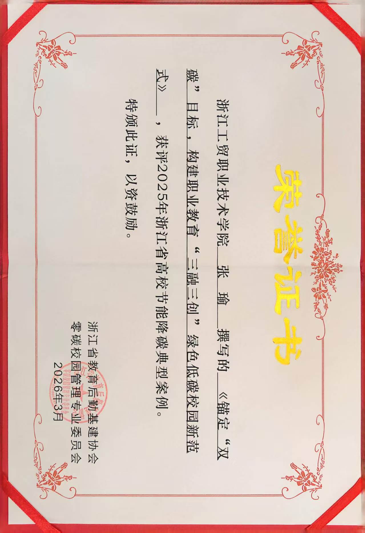 近日,2025年浙江省高校节能降碳典型案例评选结果揭晓。经自主申报、材料审核、专家评审等程序,我校后勤保障处张瑜老师撰写的《锚定“双碳”目标,构建职业教育“三融三创”绿色低碳校园新范式》成功入选,获评2025年浙江省高校节能降碳典型案例。